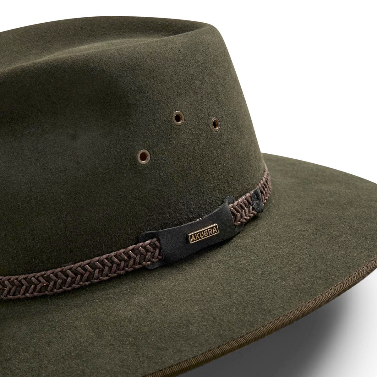 Ideal for working, the Tablelands is unlined. Nevertheless, it features a supple internal leather sweatband, embossed with the Akubra logo in gold. The crown has three eyelet vents on each side, for improved ventilation. Finishing touches include an attractive woven leather hatband, as well as brass fittings.