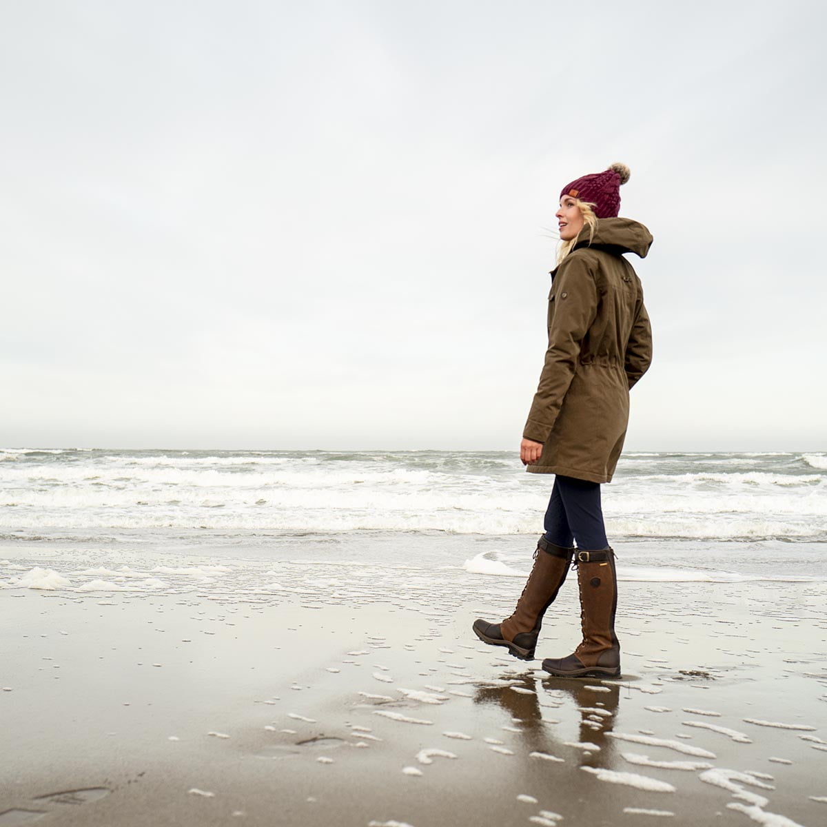 A classic look ladies long jacket with a built in hood and Primaloft® lining. Although this coat looks like a waxed cotton parka it is in fact a suede finish, waterproof and breathable, lined coat. Made using Eco-friendly modern methods and materials, this is a modern take on a tradition style coat.