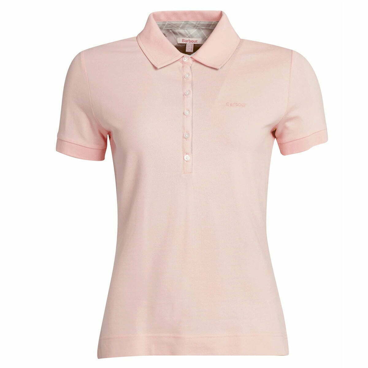 Pique polo top with tartan trim to inside collar and placket. Barbour script embroidery to left chest.
