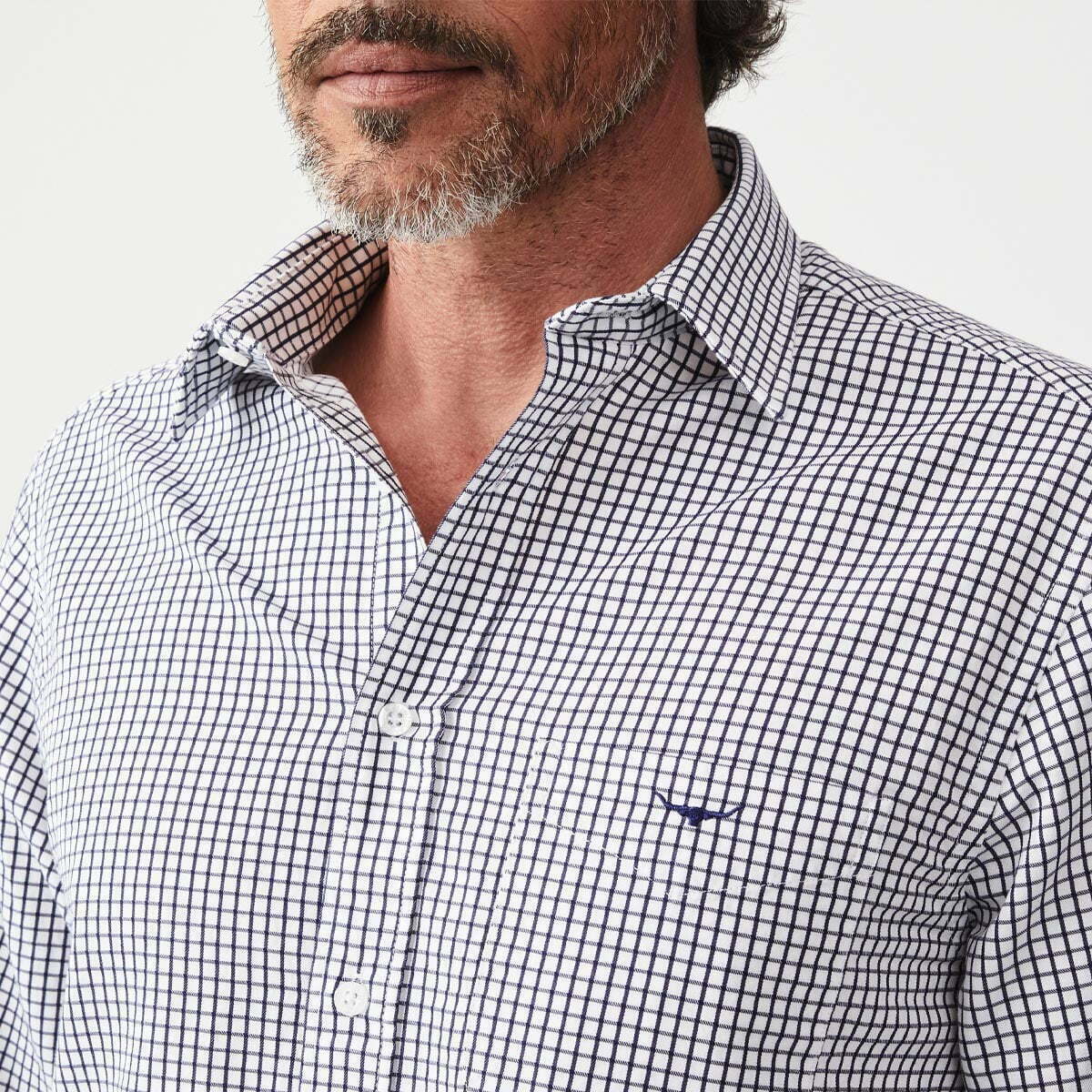 - Twill check, long sleeve shirt with standard collar & single pocket on front left.