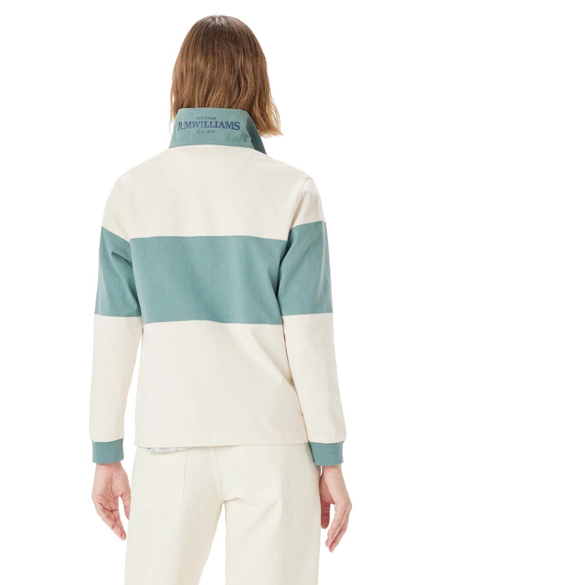 This heavyweight jersey features a brushed cotton twill collar, 2-button placket with rubber buttons, ribbed cuffs, embroidered artwork at the chest, and a back tail hem with side splits. It has a wide panel stripe and R M Williams embroidery on back of collar.