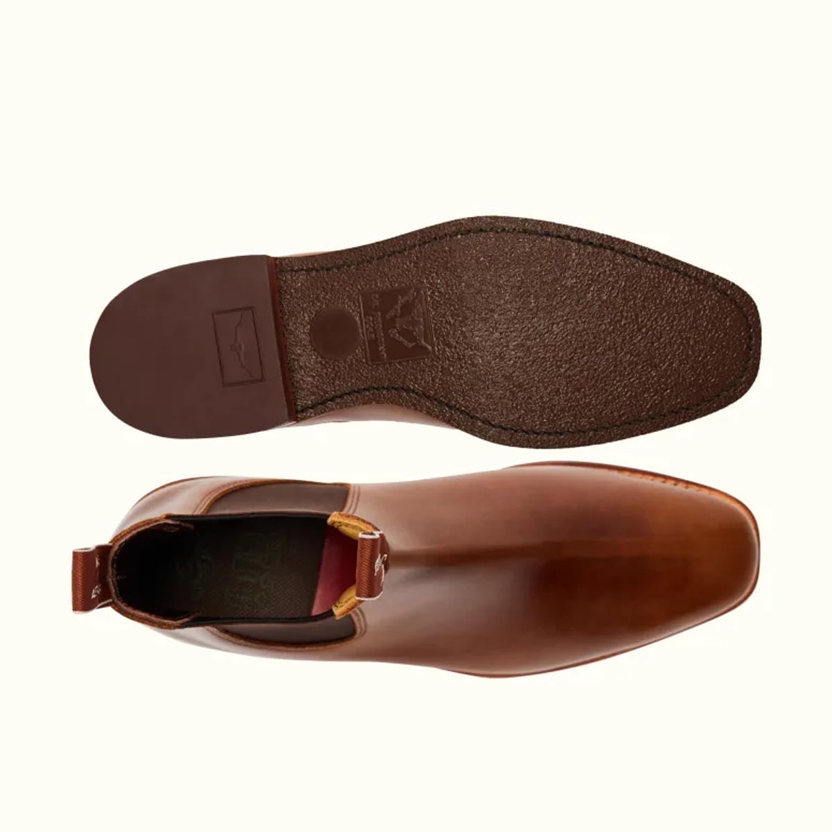 This timeless Chelsea boot features a classic chisel toe and flat heel design. It is uniquely handcrafted from a singular piece of premium leather, meaning there is only one seam at the back. They also feature elasticated side panels for movement and breathability, plus branded pull tabs for easy fit and removal. They boast Goodyear welt construction and a sleek stained finish.
