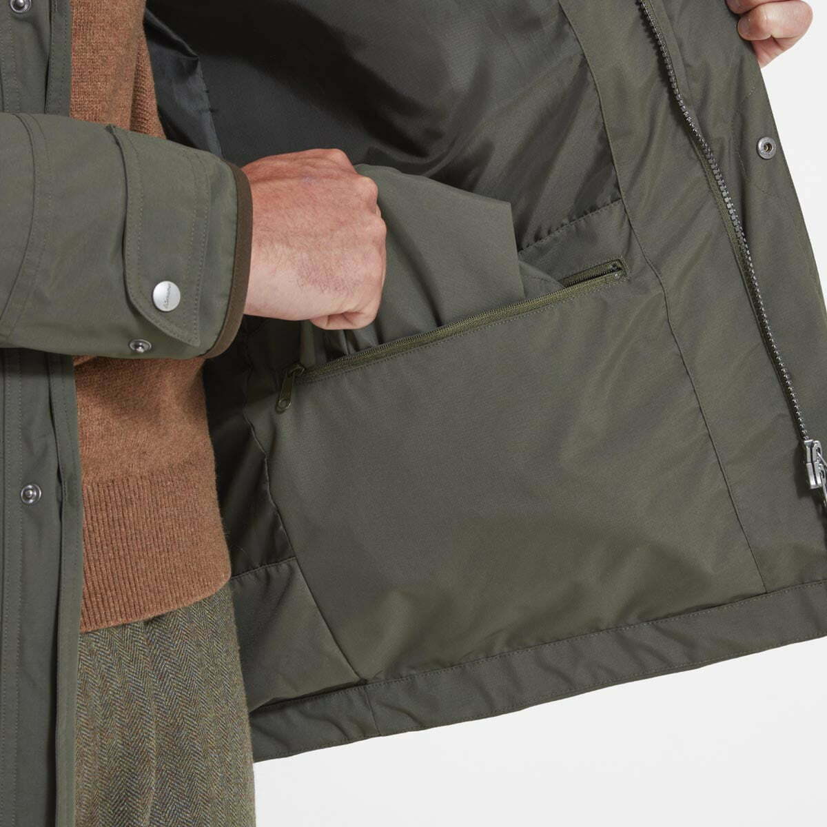 The Ptarmigan Ultralight II Coat, is 100% waterproof, windproof and highly breathable, with an upgraded fabric 20K waterproof and 20k breathability. This technical coat has a Venturi 2 layer laminate with a durable ripstop fabric. The contemporary sport cut, with an underarm gusset for ultimate lift, makes this coat comfortable for shooting and long country walks. This coat features two inside zip security pockets for storing your valuables and microfleece lined hand warming pockets with storm flaps, as respite from the cold weather. This coat packs away into its own internal pocket, ideal for showery weather and day trips out. Machine washable and quick drying, with elasticated storm cuffs and a detachable hood, this coat can be paired with an Oakham Fleece Gilet for an added layer of warmth, and a versatile country look.